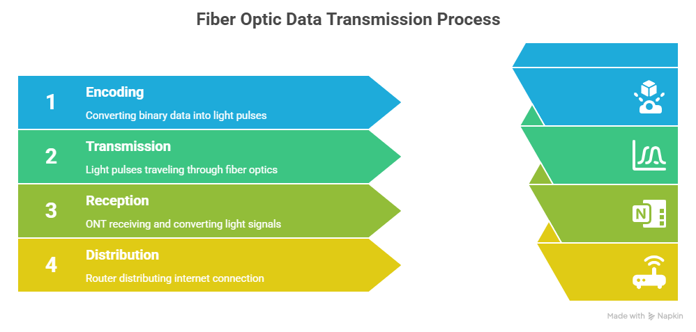 Upon reaching the user’s premises, the light pulses are received by an Optical Network Terminal (ONT). This device plays a critical role by converting the incoming optical signals back into traditional electrical Ethernet signals. From there, the user’s router distributes the connection wirelessly to devices throughout the home or office, enabling seamless access to the internet.